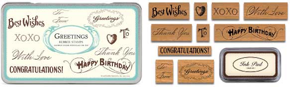 Mooie bewaardoos van blik met opdruk, inhoud 11 houten handstempels van groeten en een stempelkussen met zwarte inkt.