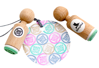 Rubberen stempel op houten montuur. Afdrukafmeting: 30x30 mm.