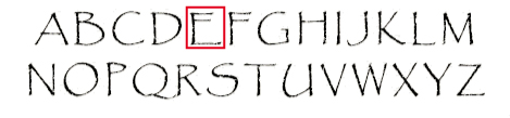 Afdruk van een: E, Klassieke Letter van het alfabet, afmeting 18 mm in diameter.