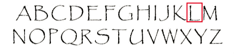 Afdruk van een: L, Klassieke Letter van het alfabet, afmeting 18 mm in diameter.