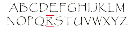 Afdruk van een: R, Klassieke Letter van het alfabet, afmeting 18 mm in diameter.