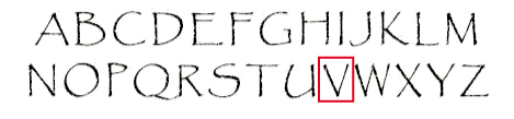 Afdruk van een: V, Klassieke Letter van het alfabet, afmeting 18 mm in diameter.