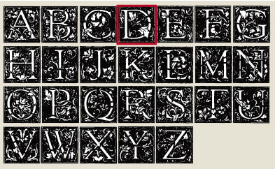 Afdruk van de letter: D van het alfabet met versieringen, afmetingen 20 x 20 mm.