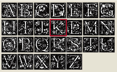 Afdruk van de letter: K van het alfabet met versieringen, afmetingen 20 x 20 mm.