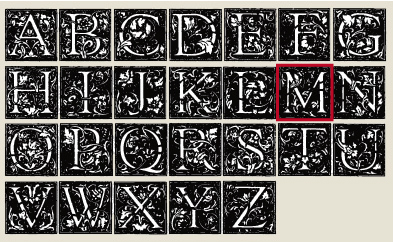 Afdruk van de letter: M van het alfabet met versieringen, afmetingen 20 x 20 mm.