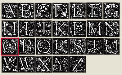 Afdruk van de letter: O van het alfabet met versieringen, afmetingen 20 x 20 mm.