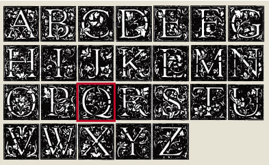 Afdruk van de letter: Q van het alfabet met versieringen, afmetingen 20 x 20 mm.