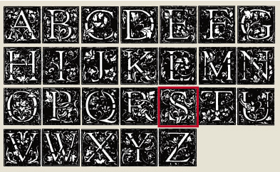Afdruk van de letter: S van het alfabet met versieringen, afmetingen 20 x 20 mm.