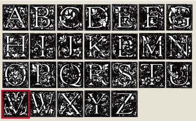 Afdruk van de letter: V van het alfabet met versieringen, afmetingen 20 x 20 mm.