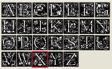 Afdruk van de letter: X van het alfabet met versieringen, afmetingen 20 x 20 mm.