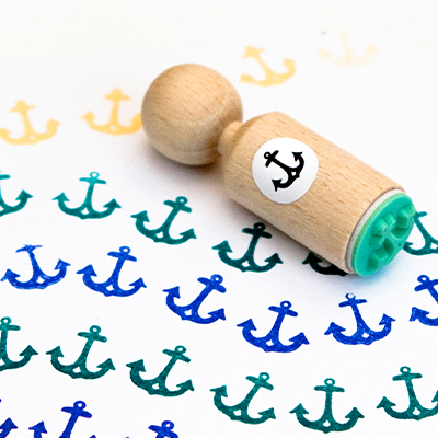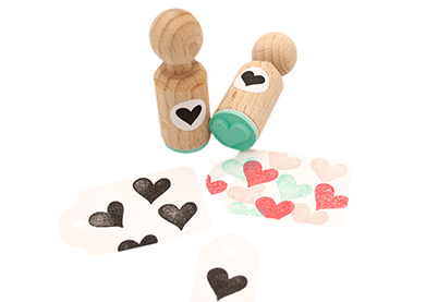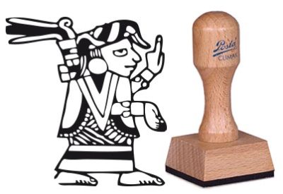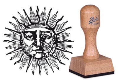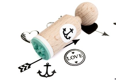 Rubberen stempel op houten montuur. Afdrukafmeting: 11x11mm.
