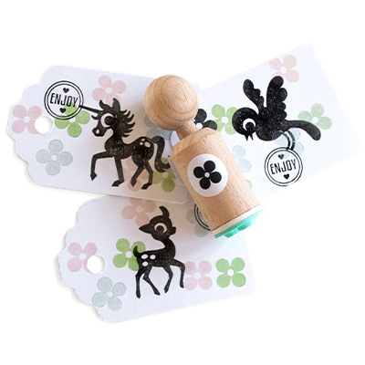 Rubberen stempel op houten montuur. Afdrukafmeting: 10x10mm.