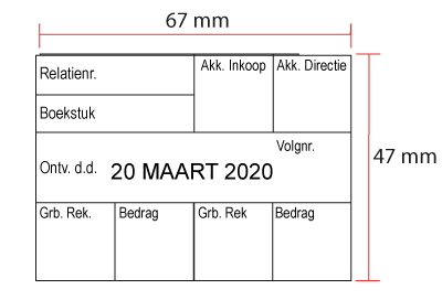 afmeting: ca. 67 x 47 mm afdrukkleur: zwart Deze boekhoudstempel is goed voor duizenden stempelafdrukken.
