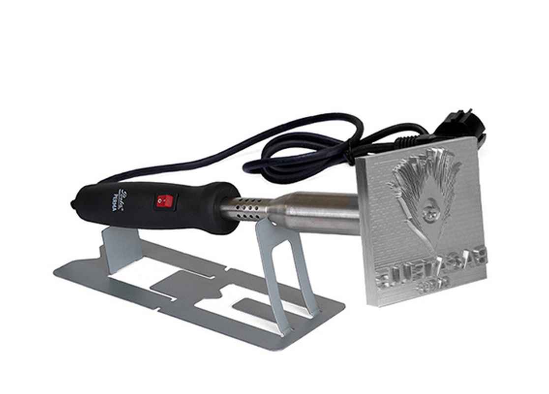 Elektrische brandstempel Posta Perma van roestvrij staal met gravure 80x80 mm, voor het onuitwisbaar brandmerken van bijvoorbeeld hout, leer en kunststof.