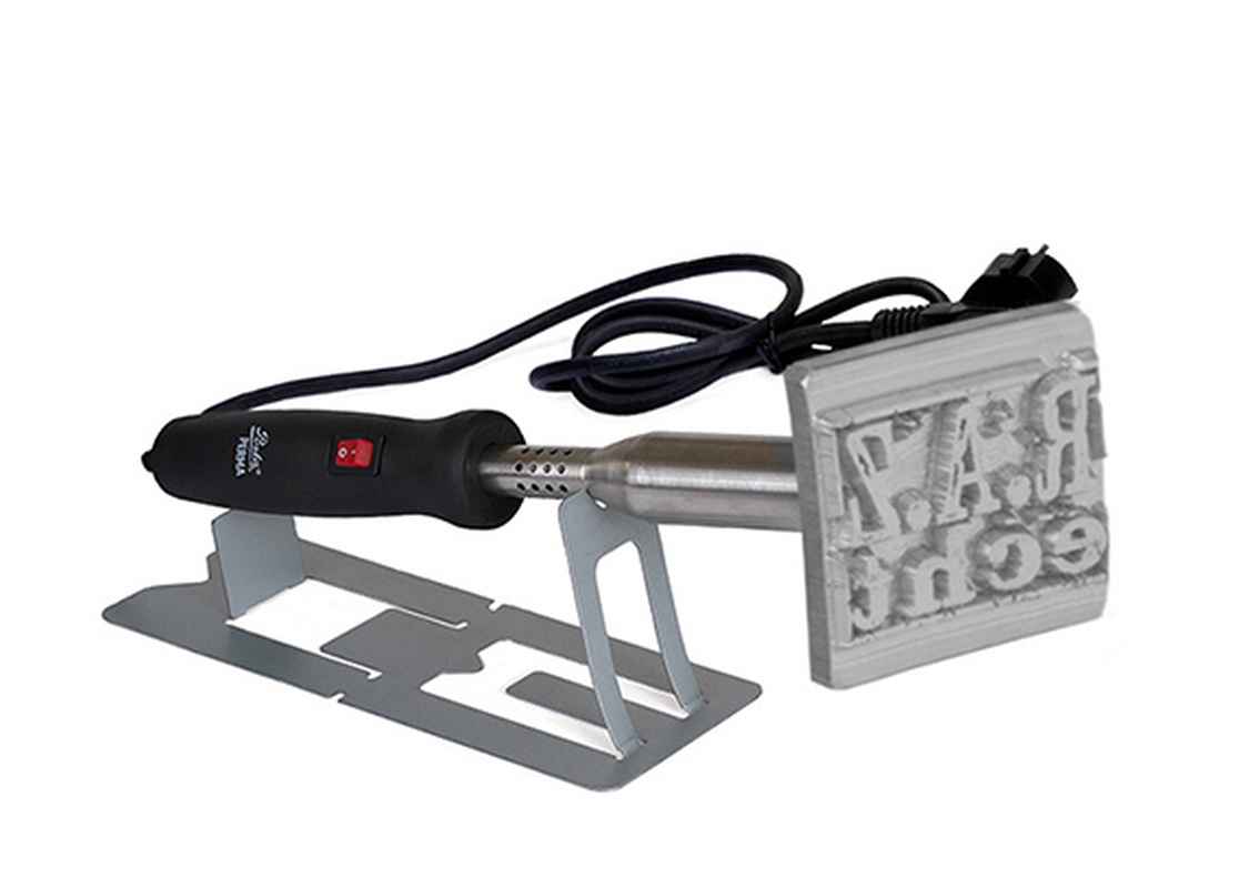 Elektrische brandstempel Posta Perma van roestvrij staal met gravure 90x80 mm, voor het onuitwisbaar brandmerken van bijvoorbeeld hout, leer en kunststof.