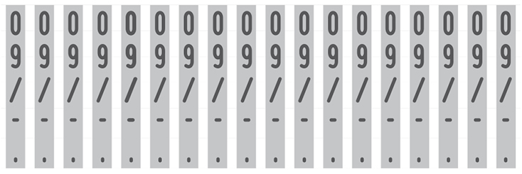 Volledig zelfinktend. Standaard voorzien van zwart inktkussen. De cijferbanden bestaan niet alleen uit cijfers, maar zijn aangevuld met tekens! b.v.; /, -, .