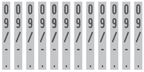 Volledig zelfinktend. Standaard voorzien van zwart inktkussen. De cijferbanden bestaan niet alleen uit cijfers, maar zijn aangevuld met tekens! b.v.; /, -, .