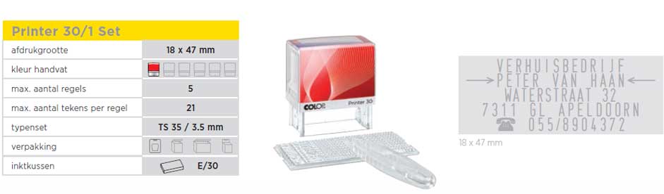 De Colop Printer 30/1 doe-het-zelf stempel combineert de voordelen van functionele zelfinktende stempels met de mogelijkheid om deze zelf in te stellen en voor het maken van een afzonderlijk bericht.