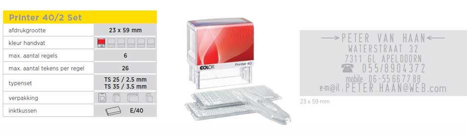 De Colop Printer 40/2 doe-het-zelf stempel combineert de voordelen van functionele zelfinktende stempels met de mogelijkheid om deze zelf in te stellen en voor het maken van een afzonderlijk bericht.