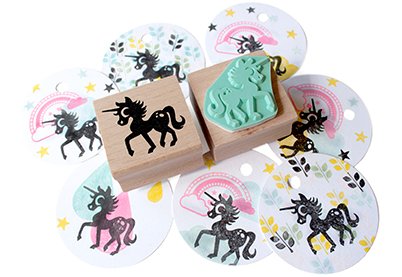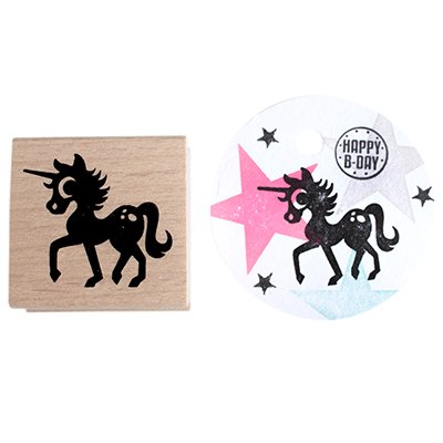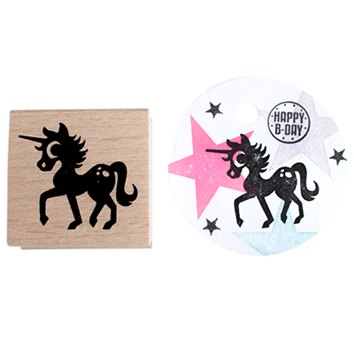 Rubberen stempel op houten montuur. Afdrukafmeting: 27x27 mm.