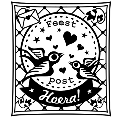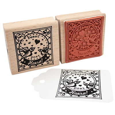 Rubberen stempel op houten montuur. Afdrukafmeting: 42x48.