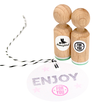 Rubberen stempel op houten montuur. Afdrukafmeting: ongeveer 14x14mm.