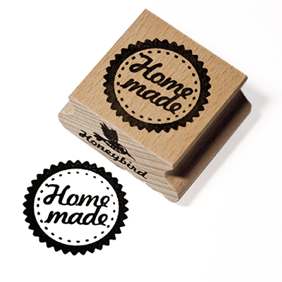 Rubberen stempel op houten montuur. Afdrukafmeting: 30x30 mm.