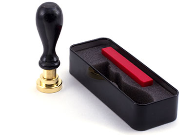 Deze lakstempel wordt geleverd in een luxe zwarte blik en een staafje rode zegellak.