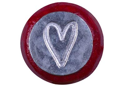 Deze lakzegels worden door de Amerikaanse kunstenares Kathy Simon uit Seattle voor ons gemaakt. De knop is gemaakt van hergebruikt glas. Op de knop is een aluminium plaatje gemonteerd met een afbeelding van een hart. Dit plaatje heeft een doorsnede van 18 mm. Door het ambachtelijke productieproces kan de kleur afwijken van de afbeelding.