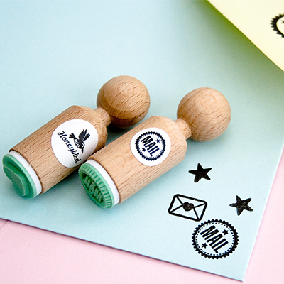 Rubberen stempel op houten montuur. Afdrukafmeting: ongeveer 14x14mm.