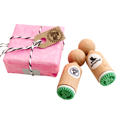 Rubberen stempel op houten montuur. Afdrukafmeting: ongeveer 14x14mm.