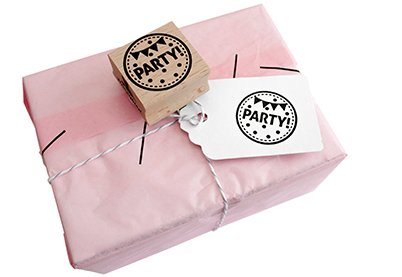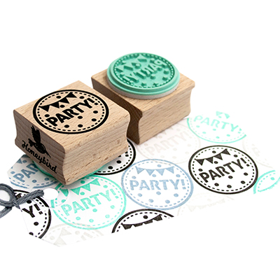 Rubberen stempel op houten montuur. Afdrukafmeting: 30x30 mm.