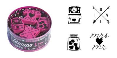 4 Leuke Stampo Liefde hobbystempels en 1 stempelkussen met zwarte inkt in een doosje.