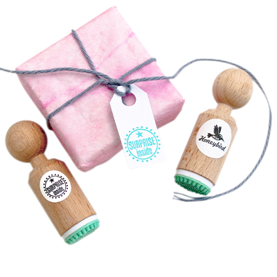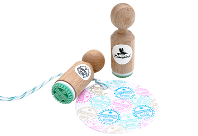 Rubberen stempel op houten montuur. Afdrukafmeting: ongeveer 14x14mm.