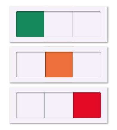 Voorzien van 3 kleurvakken, groen, oranje en rood. Een kleurvak is altijd zichbaar, door de 2 schuiven.