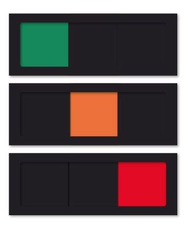 Voorzien van 3 kleurvakken, groen, oranje en rood. Een kleurvlak is altijd zichtbaar, door de 2 schuiven.