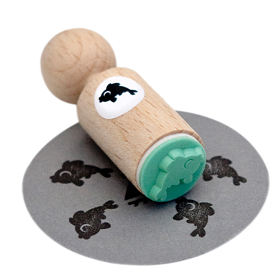 Rubberen stempel op houten montuur. Afdrukafmeting: 11x10mm.