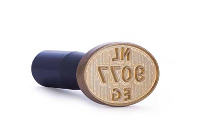 Vleeskeurstempel van messing, afdruk 67 x 47 mm. Stempel voorzien van gravure, patentknop en van slachthuiskwaliteit gemaakt.