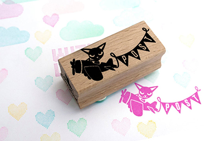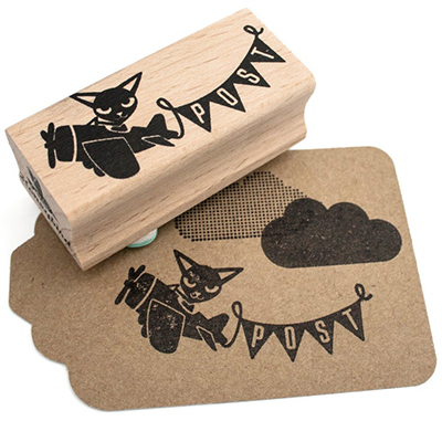 Rubberen stempel op houten montuur. Afdrukafmeting: 51x22 mm.